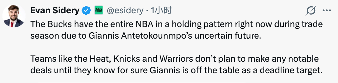 2026-01-25 01:00北京时间1月25日,据美记Evan Sidery报道,由于字母哥的未来充满不确定性,雄鹿队让整个NBA的交易市场陷入了停滞状态。像热火、尼克斯和勇士这样的球队,在确认字母哥不再是交易截止日前的目标之前,都不会计划进行任何重磅交易。