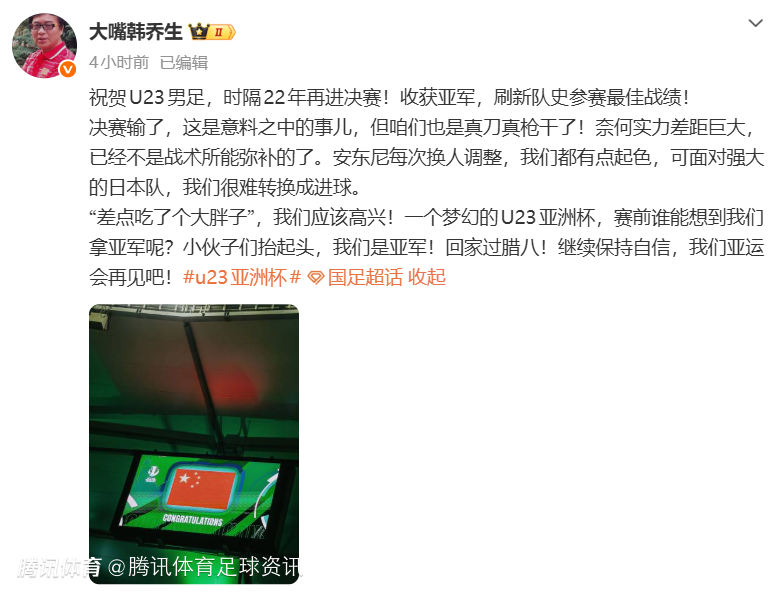2026-01-25 05:30北京时间1月25日,U23亚洲杯决赛,U23国足不敌日本U23,收获赛事亚军,这也是队史参赛的最佳战绩。赛后,知名解说员韩乔生对比赛进行了评价。