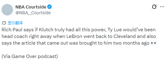 2026-01-25 06:40北京时间1月25日,知名经纪人里奇-保罗在直播节目中表示,倘若 Klutch体育经纪公司真的拥有这般绝对话语权,那么当年詹姆斯重返克利夫兰时,泰伦-卢本该立刻出任球队主教练;他还透露,此前引发热议的那篇相关报道,早在两个月前就有人拿给他看过了。