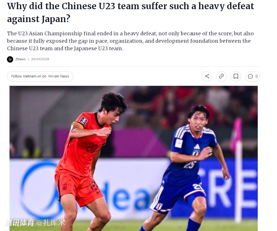 2026-01-25 11:30U23亚洲杯决赛,中国队0-4不敌日本队无缘冠军。赛后,越南媒体撰文表示,这场失利的震撼不仅来自比分,更在于它彻底暴露了中国队与日本队在比赛节奏、战术组织及青训基础上的全方位差距。