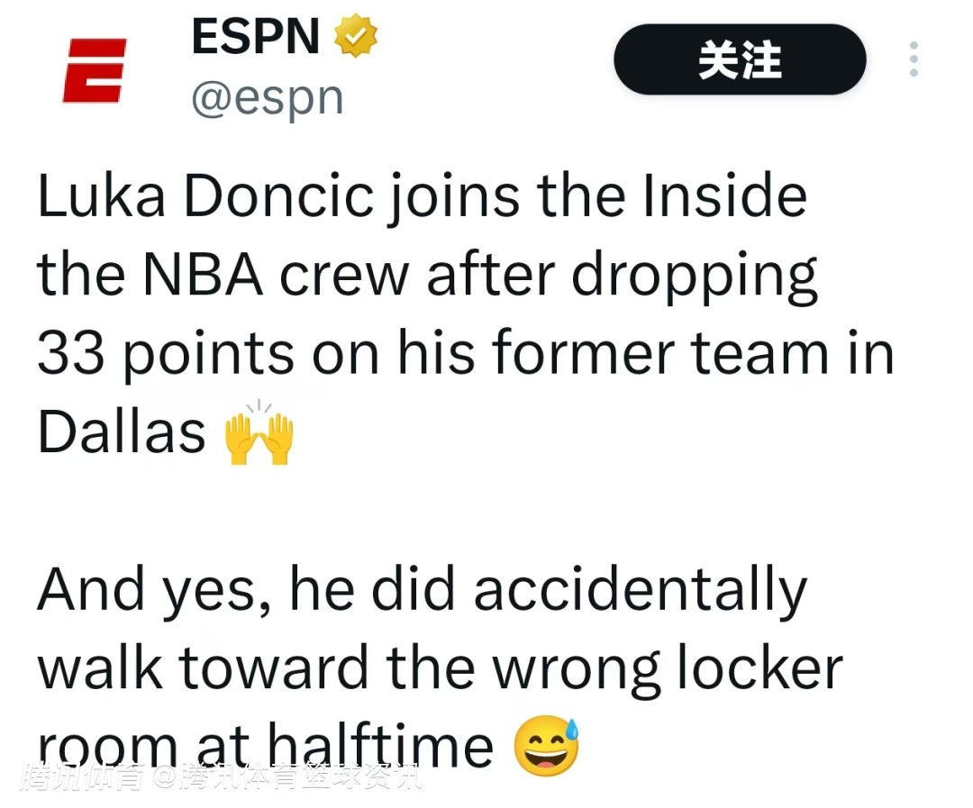 东契奇:第一次回达拉斯我走错更衣室 今天半场时我又走错球员通道