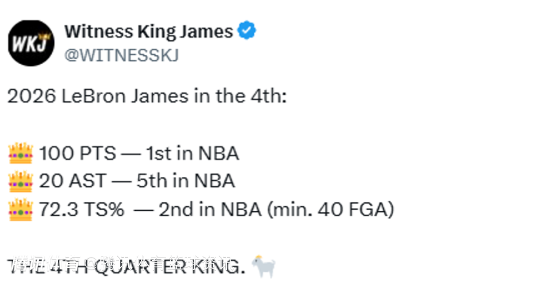 随后美媒也晒出了2026年詹姆斯在第四节的数据: