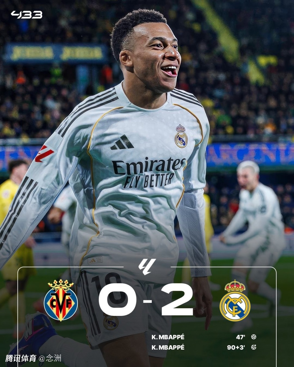 西甲第21轮,皇马客场2-0击败比利亚雷亚尔,先赛暂登顶,2分领跑积分榜。上半场双方均无建树,下半场,姆巴佩闪击破门,补时阶段,姆巴佩造点亲自主罚命中。