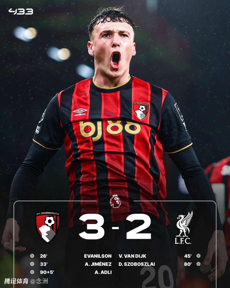 英超第23轮,利物浦客场2-3不敌伯恩茅斯,5轮联赛4平1负未尝胜绩。埃瓦尼尔森首开纪录,阿莱克斯-希门尼斯扩大领先优势,戈麦斯伤退,范戴克扳回一城,索博斯洛伊任意球破门扳平比分,阿德利补时读秒绝杀。