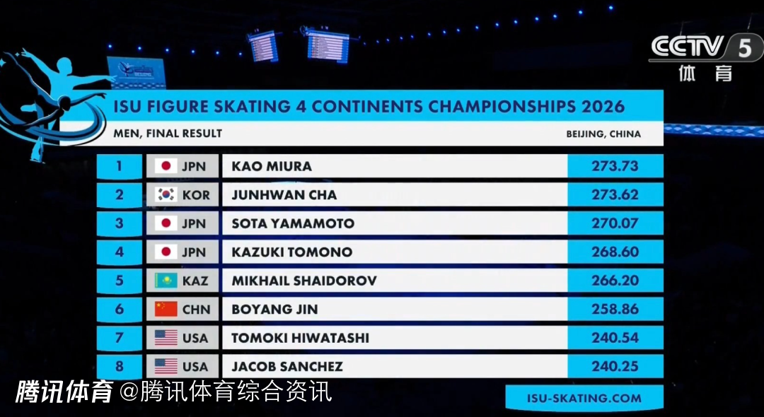 2026-01-25 16:20北京时间1月25日,2026花样滑冰四大洲锦标赛男单自由滑,金博洋获得169.40分,总分258.86分,刷新赛季最高分,获得第六名,陈昱东223.68分获得第十一名,彭智铭217.34分刷新PB获得第十三名,日本选手三浦佳生险胜韩国选手车俊焕0.11分,获得冠军。
