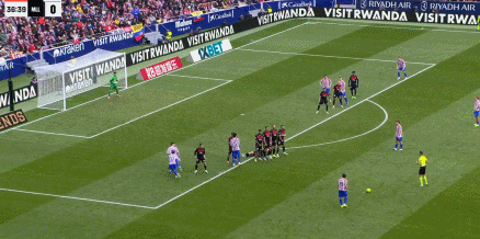 第37分钟,阿尔瓦雷斯操刀主罚禁区前沿任意球,直接将球踢到人墙之上。