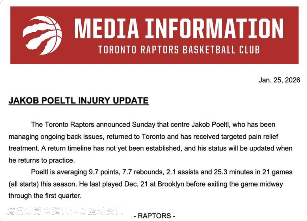 2026-01-26 00:40北京时间1月26日,多伦多猛龙队官方宣布,中锋珀尔特尔在持续受到背部问题困扰后,已返回多伦多并接受了针对性止痛治疗。目前他的复出时间表尚未确定,当他恢复训练时,球队会更新他的状态。
