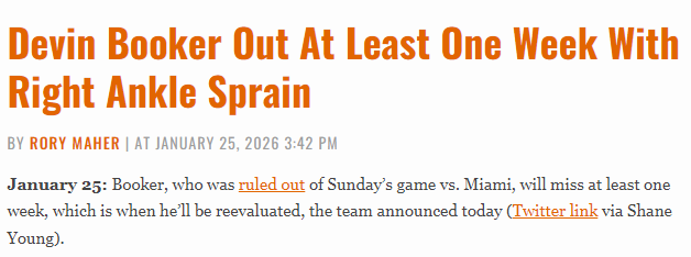 2026-01-26 06:10北京时间1月26日,太阳官方发布公告,更新队内球星布克伤情进展。此前确定缺阵对阵热火一役的布克,将至少休战一周,一周后球队会对其伤情进行重新评估。