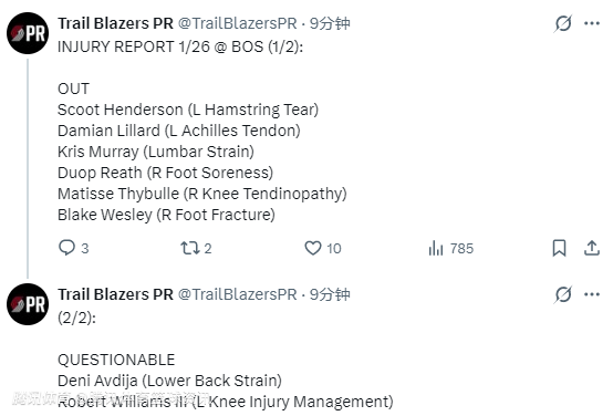 2026-01-26 06:30北京时间1月26日,NBA常规赛继续进行,开拓者明日对阵凯尔特人。赛前,开拓者方面更新球队本场比赛伤情报告,阿夫迪亚和罗威出战成疑。
