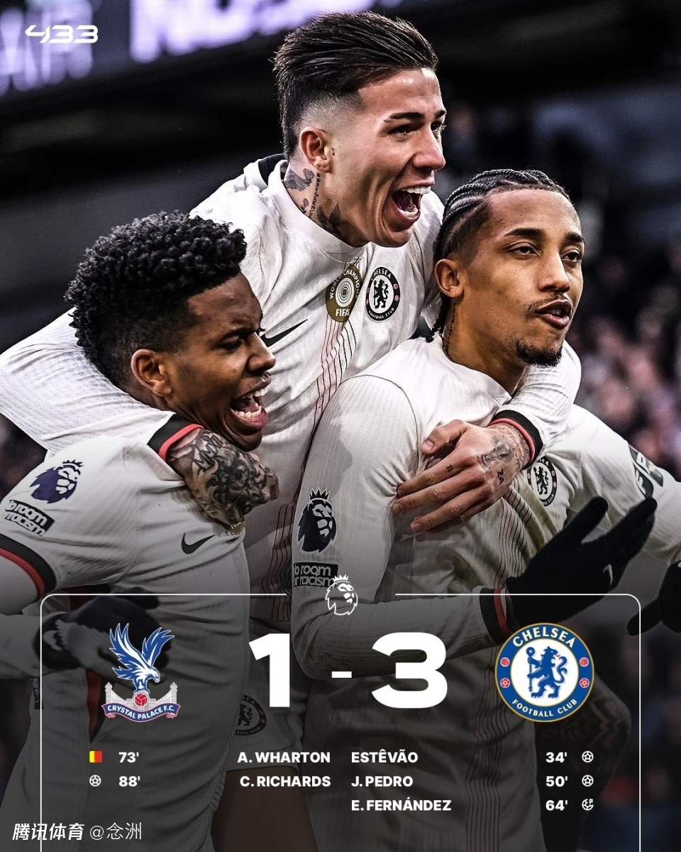 切尔西客场3-1水晶宫,各项赛事三连胜。埃斯特旺抓住对手失误一条龙破门,埃斯特旺助攻若昂-佩德罗再下一城,若昂-佩德罗射门造成坎沃手球,恩佐点射打进,沃顿两黄变一红被罚下,理查兹扳回一球。
