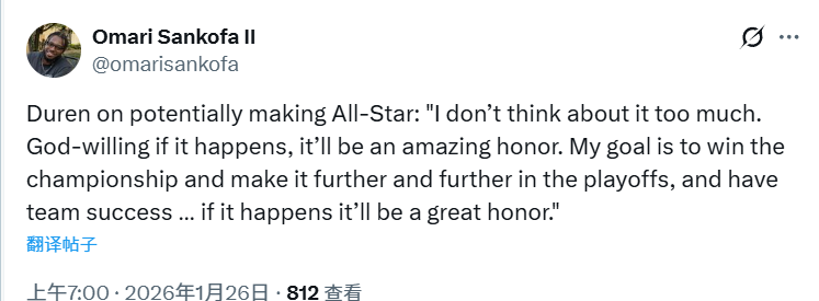 杜伦在谈及冲击全明星的可能性时表示:“我不会过多去想这件事。如果天意使然能入选,那会是无上的荣誉。我的目标是拿下总冠军,在季后赛中走得越来越远,带领球队取得佳绩……倘若真能入选全明星,那自然是莫大的荣幸。”