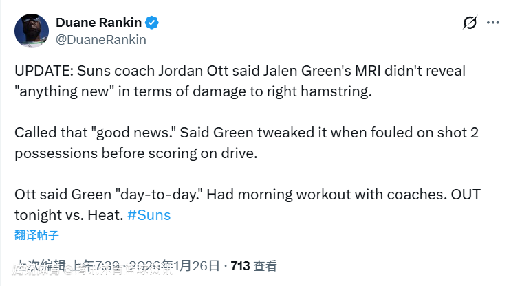 2026-01-26 08:20北京时间1月26日,NBA常规赛继续进行,太阳对阵热火。赛前,太阳官方确认杰伦-格林(伤病管理)将缺席本场比赛。