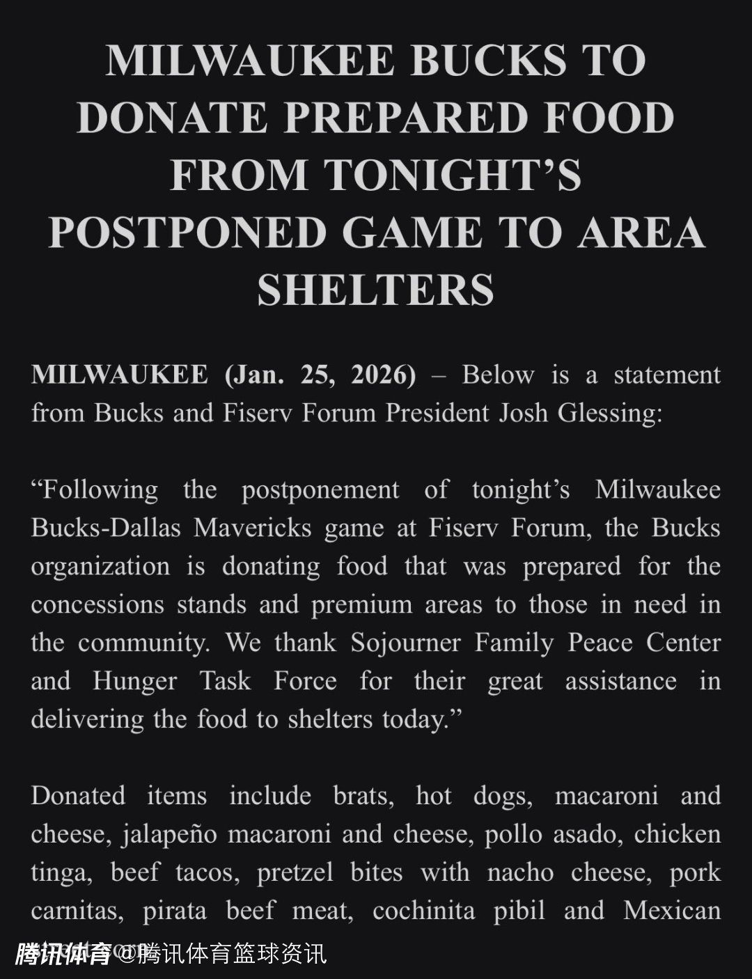 雄鹿官方与费哲论坛球馆总裁Josh Glessing发布联合声明称:“在费哲论坛球馆承办的雄鹿对阵独行侠的比赛确定延期后,球队已着手将为场内特许摊位及高端观赛区域准备的食物,捐赠给社区困难群体。在此,我们由衷感谢‘旅居者家庭和平中心’与‘饥饿专责组’,为今日将这些食物运送至收容所提供的大力支持。”