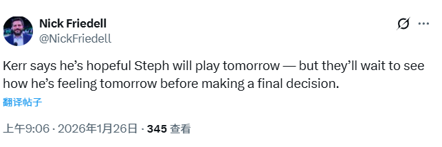 2026-01-26 10:10北京时间1月26日,NBA常规赛继续进行,勇士队111-85大胜森林狼队。库里此役18投7中得到26分7助攻,赛后,勇士队主教练科尔接受媒体采访,谈到了库里的情况。