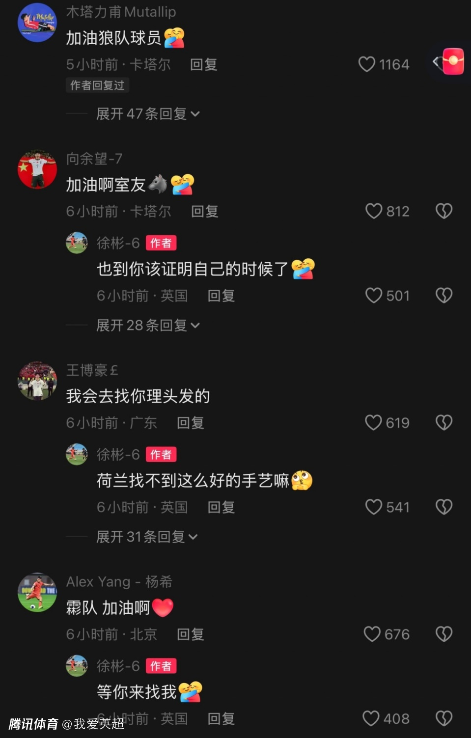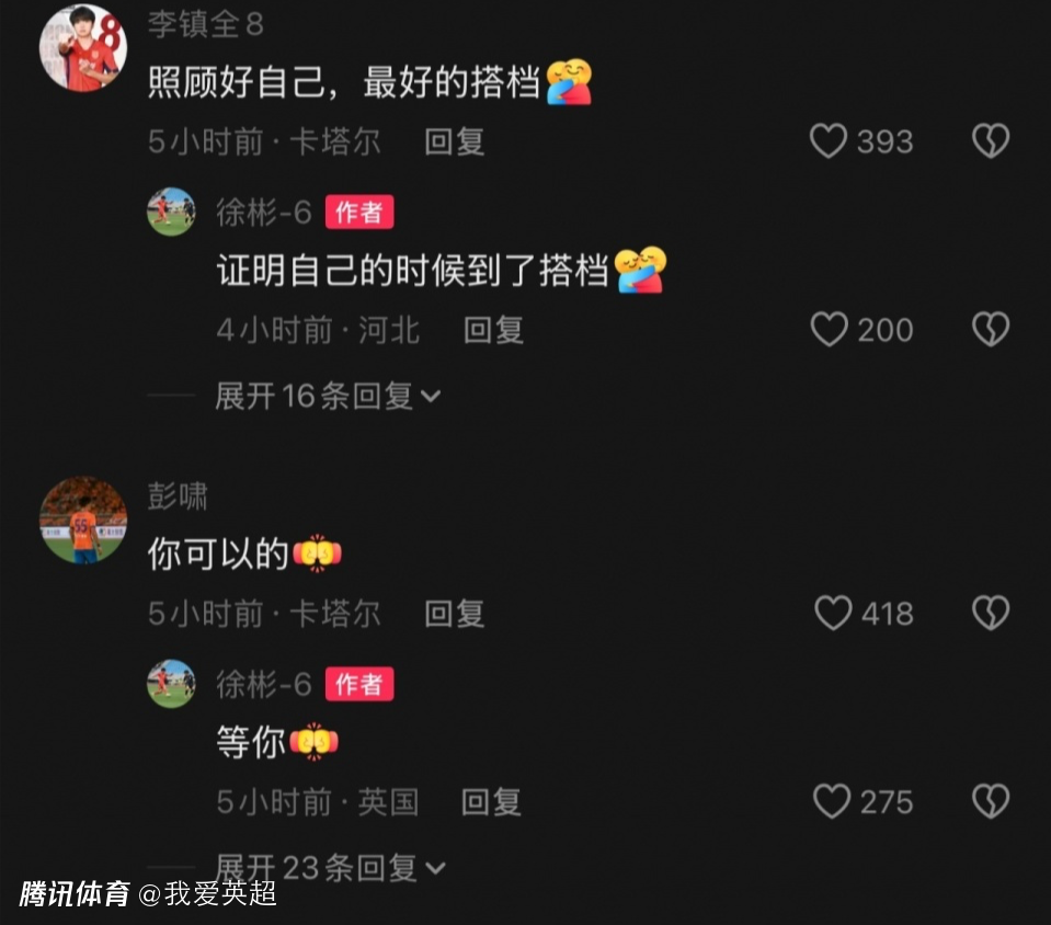 同样在欧洲留洋的王博豪则写道:“我会去找你理头发的。”边后卫杨希则说道:“霦队,加油啊。”中场搭档李镇全则评论道:“照顾好自己,最好的搭档。”中卫彭啸写道:“你可以的。”