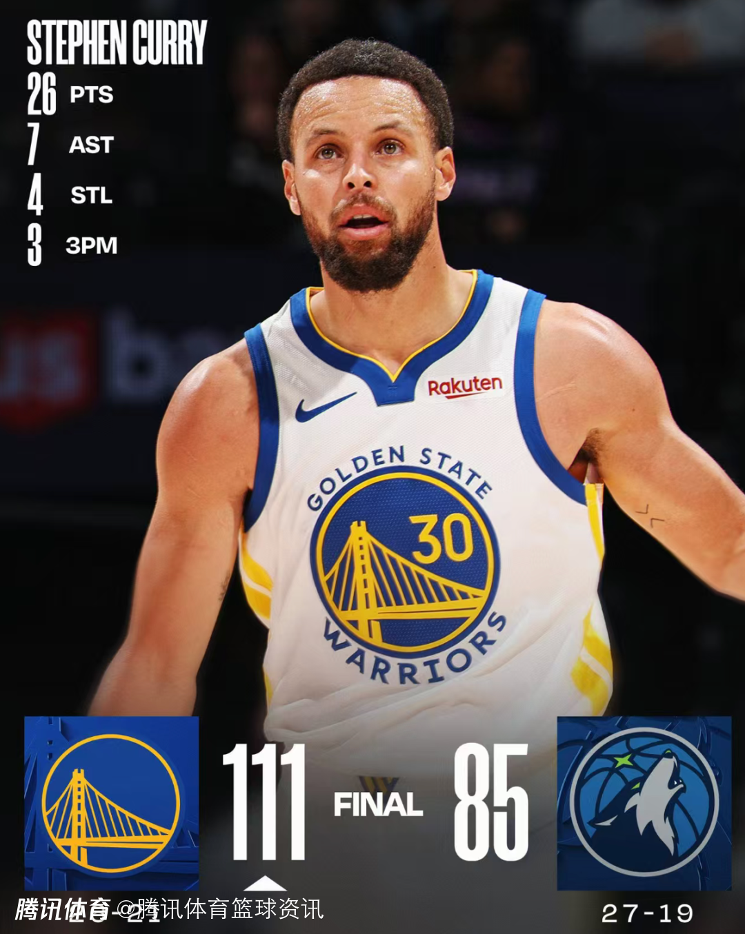 2026-01-26 10:50北京时间1月26日,NBA常规赛继续进行,勇士111-85战胜森林狼。本场比赛中,勇士球星库里出战27分钟,18投7中,其中三分10中3,罚球9中9,得到26分2篮板7助攻4抢断。赛后,他接受媒体采访。