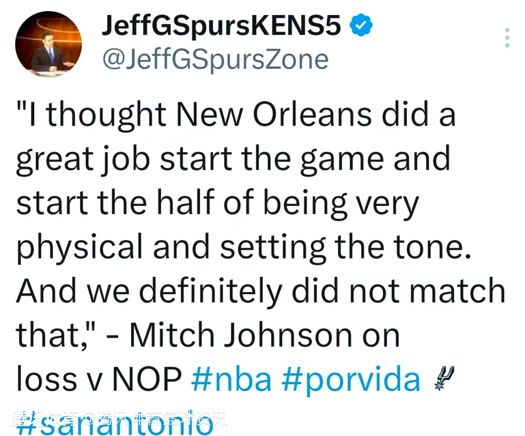 2026-01-26 11:20北京时间1月26日,NBA常规赛继续进行,马刺以95-104不敌鹈鹕。赛后,马刺主帅米奇-约翰逊接受媒体采访。