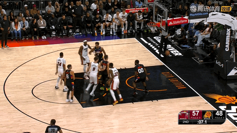 第二节还剩6分59秒至本节结束期间,太阳队9次三分出手全部偏出,阿伦、奥尼尔、狄龙和古德温等人的外线尝试均未命中,热火在这段时间里把原本2分的微弱优势扩大到10分,为后面的胜势打下基础。