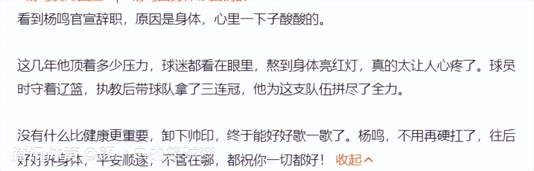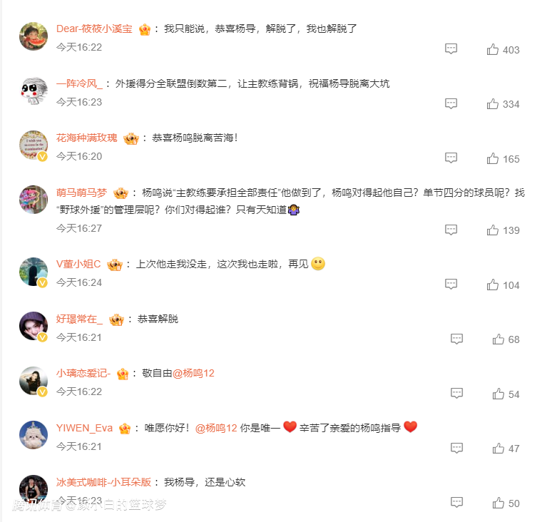 不少的球迷都在辽宁男篮官方下恭喜杨鸣脱离苦海,杨鸣指导解脱了,球迷们也解脱了。