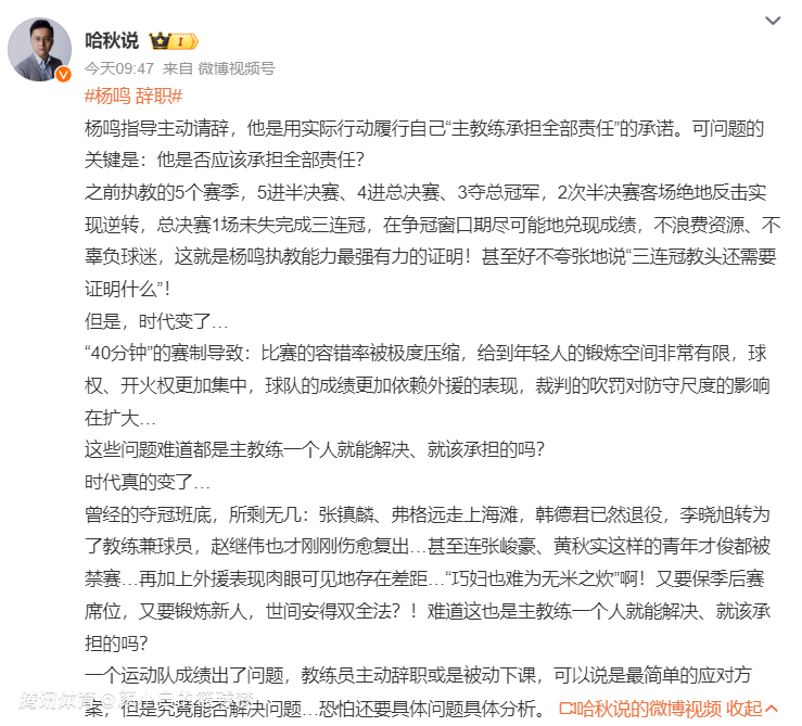 不希望杨鸣指导离职,他应该带10多年才好,他已经证明过自己的实力,有好阵容就可以夺冠。