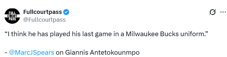 2026-01-27 05:10北京时间1月27日,雄鹿队球星字母哥正处于小腿拉伤的恢复期,此前他曾预估自己可能会缺阵4至6周,目前其确切复出时间仍未可知。名记Spears在节目上表示:“我认为他已经打完了身披密尔沃基雄鹿队球衣的最后一场比赛,”