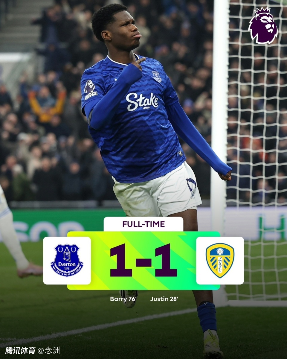 英超第23轮,埃弗顿主场1-1战平利兹联,斯塔赫助攻贾斯汀先拔头筹,勒温中柱,恩迪亚耶、巴里失良机,巴里建功,盖耶中框。