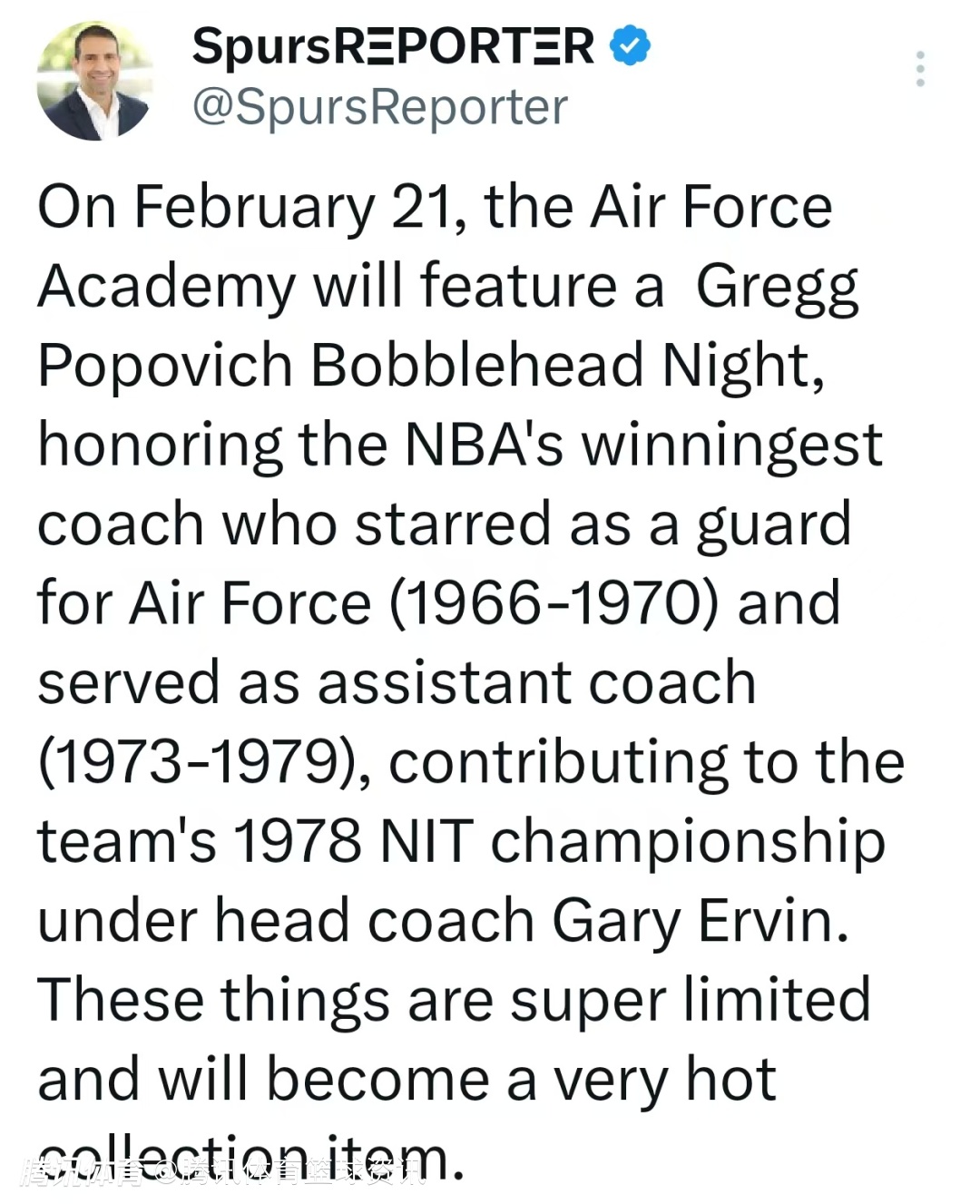 空军学院体育部此前官宣,这场赛事定为波波维奇摇头娃娃日,以此致敬这位长期执教马刺、率队斩获五座NBA总冠军的名帅。前1000名入场的球迷,将免费领取限量版波波维奇摇头娃娃。