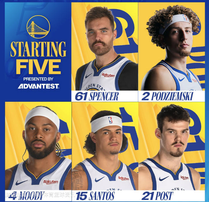 勇士队的首发阵容为:斯宾塞、波斯特、桑托斯、穆迪、波杰姆斯基。此役,勇士队有7名球员缺阵,他们是斯蒂芬-库里、塞斯-库里、德雷蒙德-格林、吉米-巴特勒、霍福德、库明加和梅尔顿。