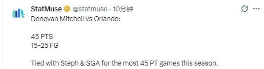 2026-01-27 11:00北京时间1月27日,NBA常规赛继续进行,骑士队114-98击败魔术队。米切尔此役25投15中得到45分4篮板4助攻,根据数据统计显示,这是米切尔本赛季第3次单场砍下45+,与亚历山大、库里并列排在联盟之首。