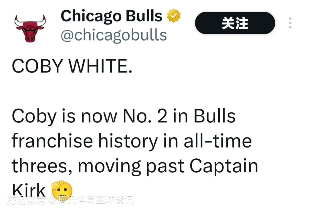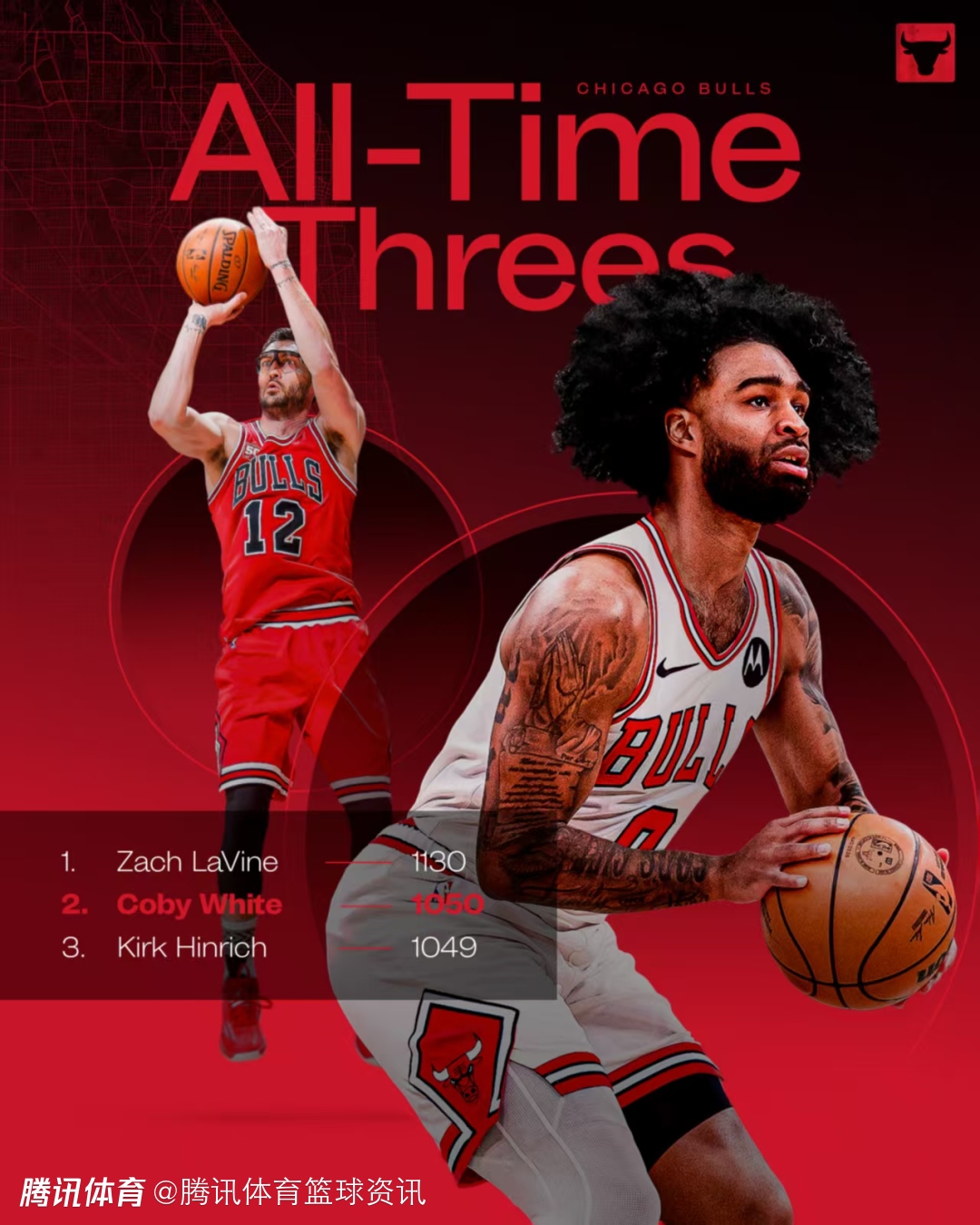 里程碑!科比-怀特命中第1050记三分 超辛里奇登公牛队史三分榜第二