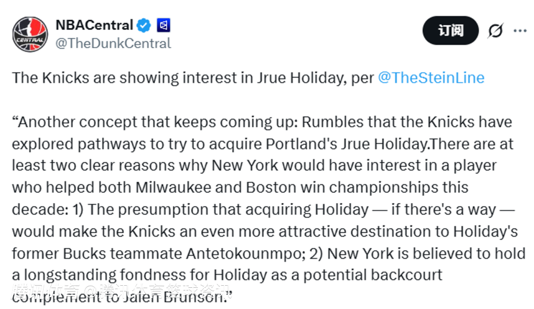Stein表示:“另一个不断被提及的消息是,有传闻称尼克斯正在探索交易得到波特兰开拓者队的朱-霍勒迪的可能性。纽约之所以对这位过去十年间先后帮助密尔沃基雄鹿和波士顿凯尔特人夺冠的球员感兴趣,他们认为,如果能得到霍勒迪,将让尼克斯对霍勒迪的前雄鹿队友字母哥更具吸引力;另外,尼克斯方面长期以来都认为,霍勒迪是布伦森的完美后场搭档。”