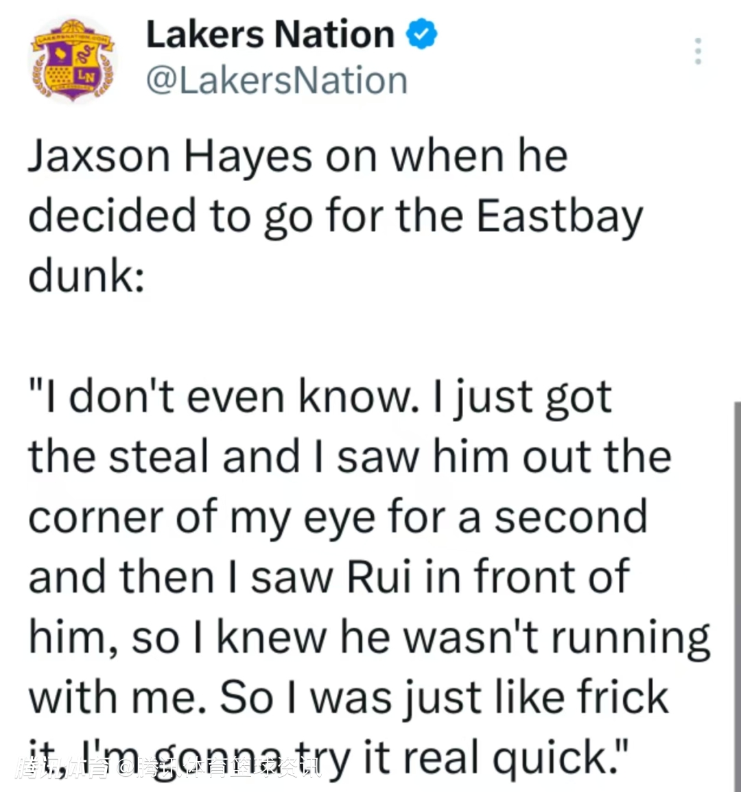 谈到自己为何选择完成这次扣篮,海斯表示:“我自己都懵的,刚断下球,余光瞥见防守球员一秒,又看到八村垒挡在他身前,就知道他追不上我了。索性想着管他呢,赶紧试试这一记。”