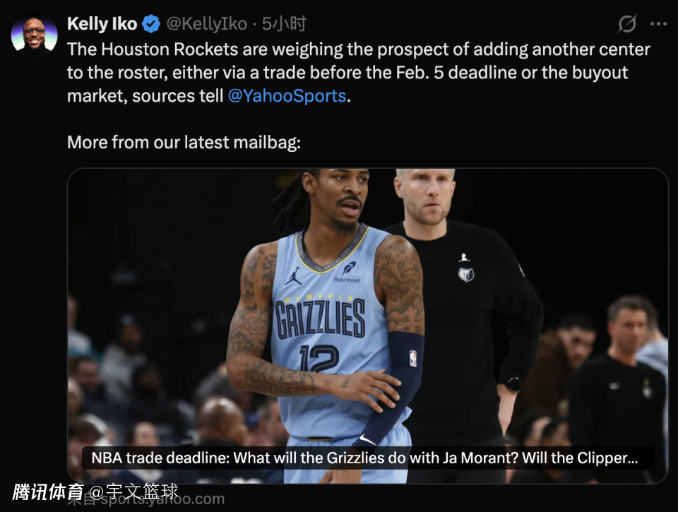 2026-01-27 15:30北京时间1月27日,雅虎体育记者Kelly Iko在最新一期播客节目中,聊到了交易截止前的动态传闻,其中包括灰熊当家球星莫兰特,灰熊有意愿在交易截止前将其送走,并且热火看起来对他非常感兴趣,或同时追求莫兰特和字母哥组建超级双人组。