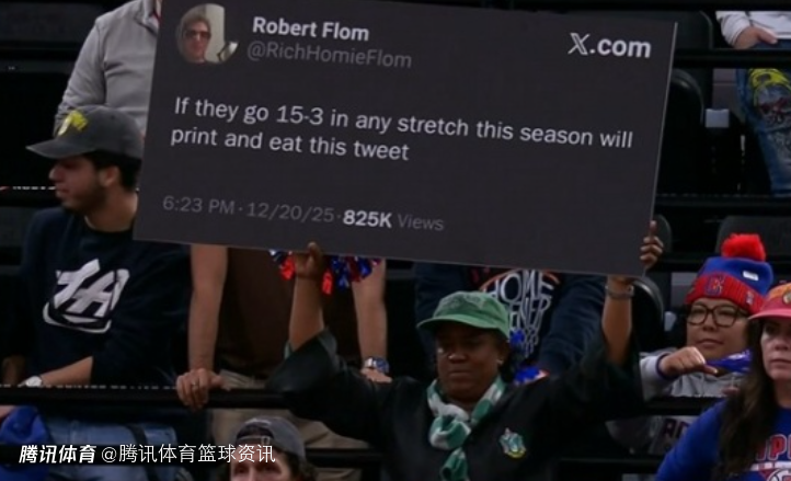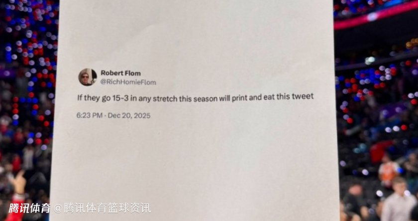 此前曾有网友Robert Flom立下豪言:若快船本赛季任意阶段打出15胜3负的战绩,他就把这条推文打印出来吃掉。这句赌约随即快船球迷墙高调展示。