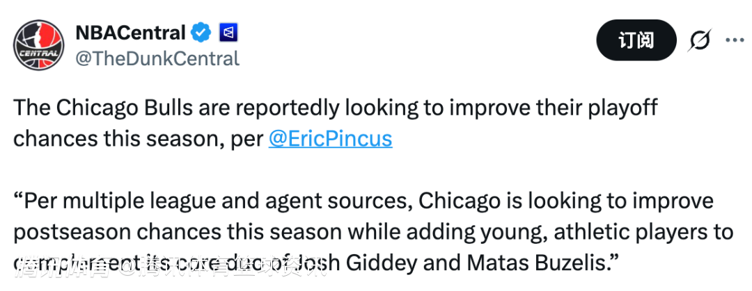 据多位联盟及经纪人消息源透露,公牛队希望在提升本赛季季后赛机会的同时,引进年轻且运动能力出色的球员,来辅佐球队核心吉迪与布泽利斯。