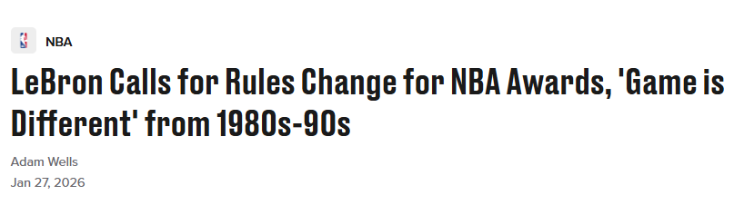 詹姆斯说道:“想想看,未来公布最佳阵容一二三阵的时候,名单里竟然没有约基奇、字母哥,或者要是我的队友东契奇因为缺阵场次不够,也失去了入选资格,这简直太荒谬了。”