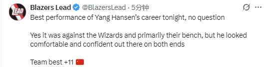 2026-01-28 10:50北京时间1月28日,NBA常规赛继续进行,开拓者队111-115不敌奇才队。杨瀚森此役6投2中得到6分5篮板1助攻,在场正负值+11全队最高。赛后,开拓者媒体Blazers Lead发文点赞了杨瀚森的表现。