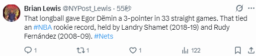 上半场比赛结束前52.1秒,德明接到曼恩的传球,顶着对手的封盖干扰,投中了个人本场比赛首记三分球,完成了里程碑。而在德明完成里程碑后,众多篮网队的媒体和记者也发文对他表示了祝贺。