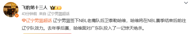 2026-01-28 11:40北京时间1月28日,根据国内媒体报道,“辽宁男篮签下外援泰勒·哈维,他将在完成这赛季的澳洲NBL比赛之后前往辽宁队报到。”