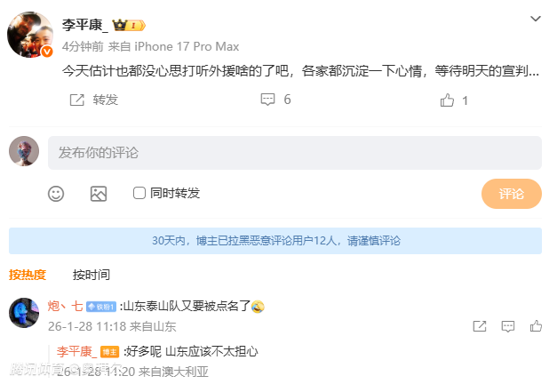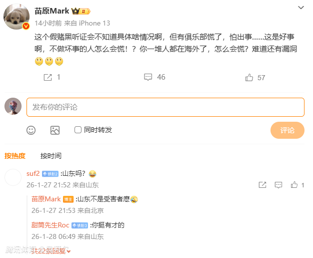 2026-01-28 11:40周三,多名媒体人相继暗示,假赌黑听证会的结果将在周四公布,李平康表示,“山东应该不太担心”。