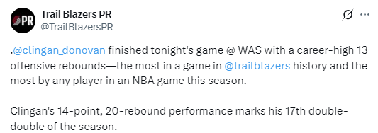 2026-01-28 12:10北京时间1月28日,NBA常规赛继续进行,开拓者队111-115不敌奇才队。克林根此役17投6中得到14分20篮板,其中有13个进攻篮板,这也让他迎来生涯新里程碑。