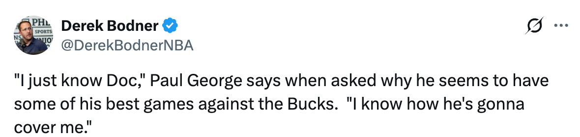 当被问及为何对阵雄鹿时总能打出代表作,乔治表示:“我太了解老里了,我懂他的防守体系,懂他的战术布置,知道他在观察什么、想要什么,也知道他会怎么安排人来防我。”