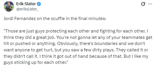 费尔南德斯表示:“球员们只是在彼此守护、为队友挺身而出,他们做得很好。你绝不会看着自己的队友被冲撞、被推搡,或是遭受任何不公对待。当然,赛场上有底线,我们也不希望任何人受伤,但比赛中确实出现了一些小动作。裁判有的吹罚了,有的则没有。我认为正是这些判罚的争议,让场面一度失控。但我很欣慰,我的队员们会为彼此出头。”