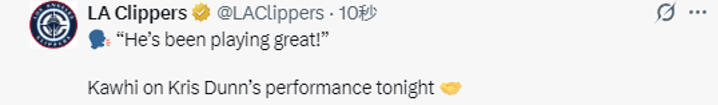 在谈到邓恩的表现时,莱昂纳德说道:“他是我们阵中不可或缺的重要一员。每晚登场,他都会拼尽全力去锁死对方的核心球员,竭尽所能延缓对手的进攻节奏。就像你说的,他今晚不仅完成5次抢断,还把握住了空位出手机会,表现堪称完美。”