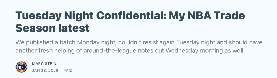 2026-01-28 14:50北京时间1月28日,名记Marc Stein在个人播客节目中聊到了交易市场的最新动态传闻,其中热火有信心成为字母哥的下家,湖人有望在截止日前送走克内克特等多则消息。