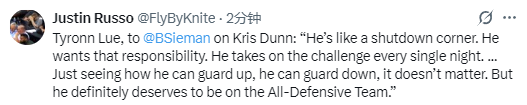 卢表扬了邓恩,他说道:“邓恩就是联盟顶级的锁防尖兵,一心想扛起防守重任,每晚都会主动迎接最强的防守挑战。他既能对位防守外线球员,也能下沉防守内线球员,无论面对何种对手都游刃有余。毫无疑问,他完全配得上入选最佳防守阵容。”
