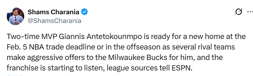 2026-01-29 01:00北京时间1月29日,据名记Shams报道,联盟消息人士向ESPN透露,两届常规赛MVP得主字母哥已做好在2月5日交易截止日前更换东家的准备。多支球队已向密尔沃基雄鹿队开出重磅报价,而雄鹿方面目前也已开始听取相关方案。