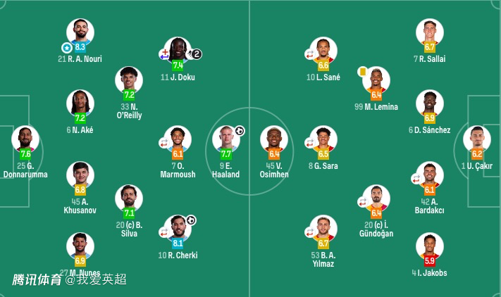 曼城出场阵容:25-多纳鲁马、6-阿克、21-努里、27-努内斯、45-胡桑诺夫、33-奥赖利、20-B席、10-谢尔基
