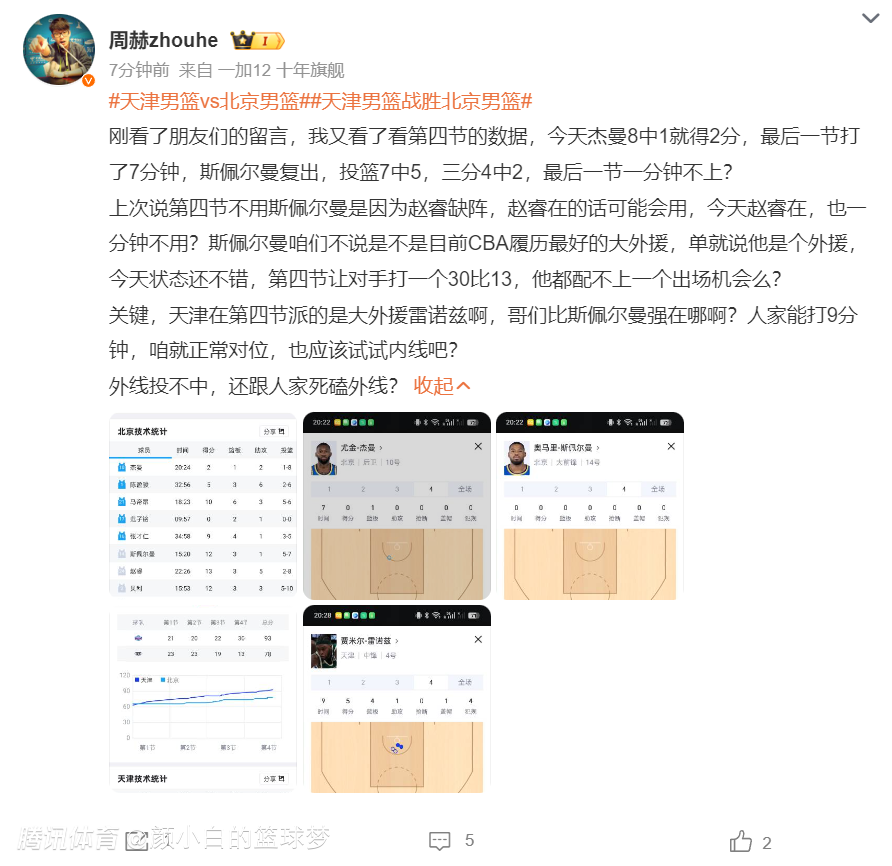 媒体人周赫对北京这场失利非常不满,他认为末节该弃用的是8中1的杰曼而非斯佩尔曼,因为末节天津是用雷诺兹,北京这边应该让斯佩尔曼上去限制他的发挥。