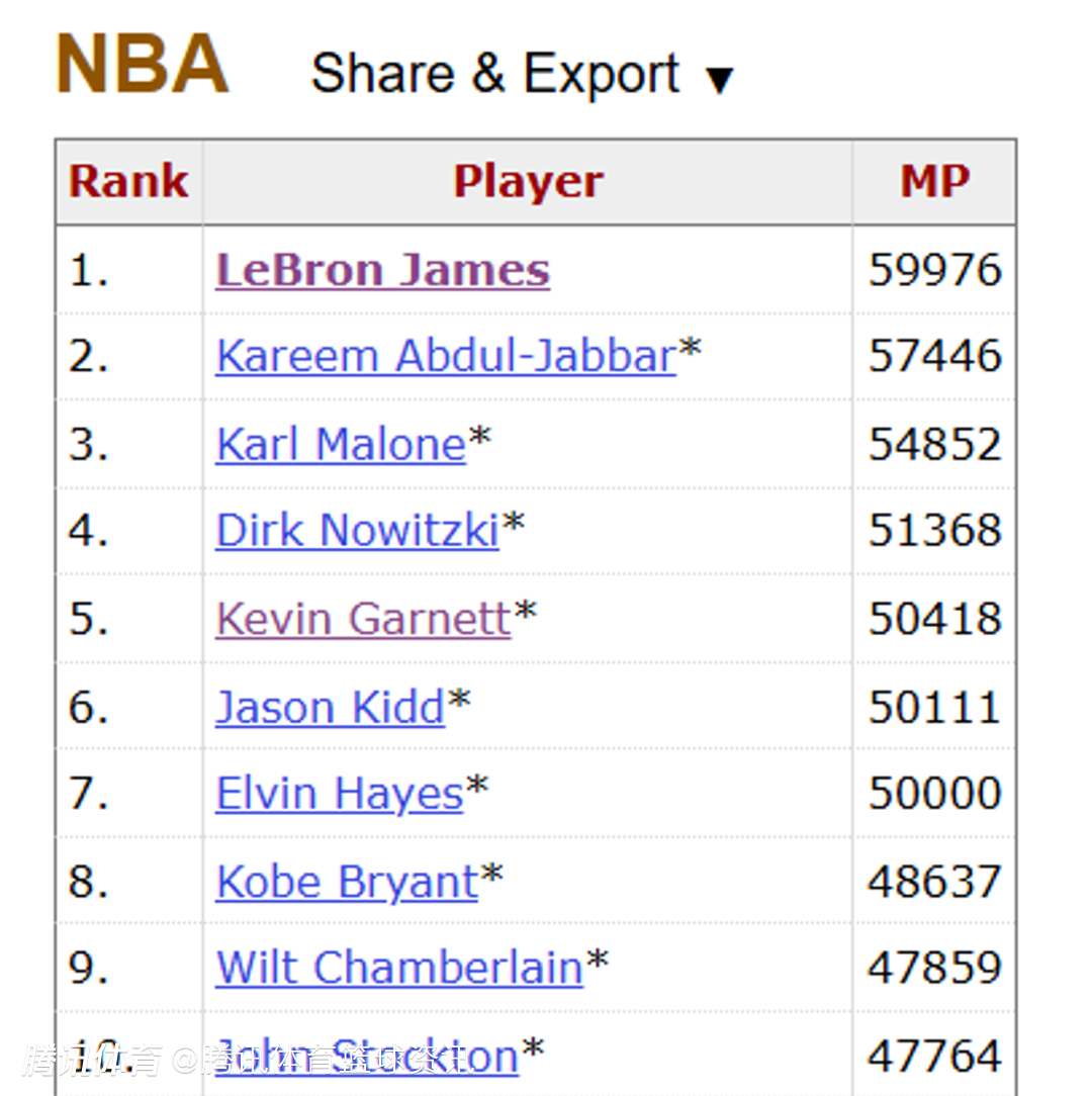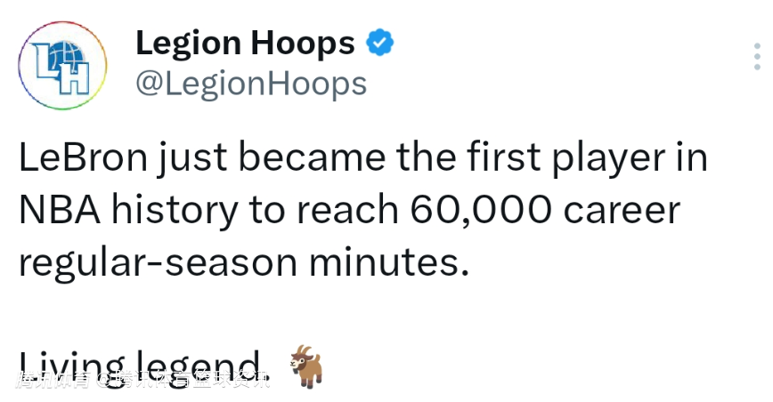 本场比赛之前,詹姆斯的常规赛总上场时间为59976分钟,断层历史第一,在今天对阵骑士的比赛中,他在出场24分钟时,职业生涯常规赛总上场时间来到了60000分钟,成为NBA历史上首位达成这一里程碑的球员。